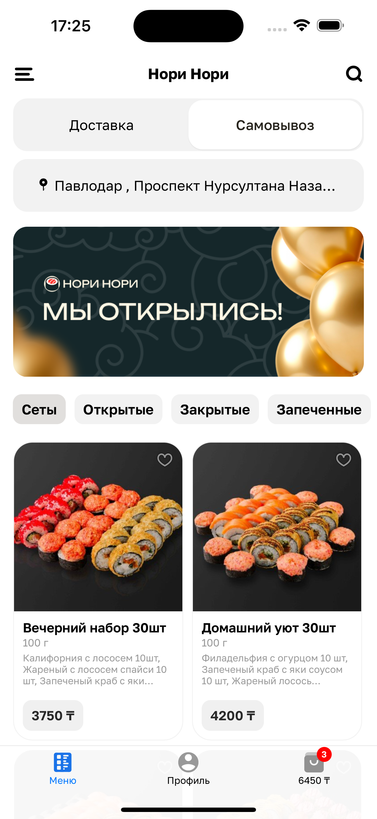 Филадельфия с огурцом 10 шт. Калифорния с лососем 10 шт. Лава с креветкой 10 шт. Небраска с ореховым соусом 10 шт. Нежный краб терияки 10 шт. Жареный с креветкой и сыром 10 шт. Жареный сырный цыплёнок 10 шт. Закрытый с лососем и сыром 10 шт. Закрытый с чукой 10 шт. Закрытый с креветкой 10 шт. Пепперони Маргарита Сырная Картофель фри большой Картофельные шарики 150 г